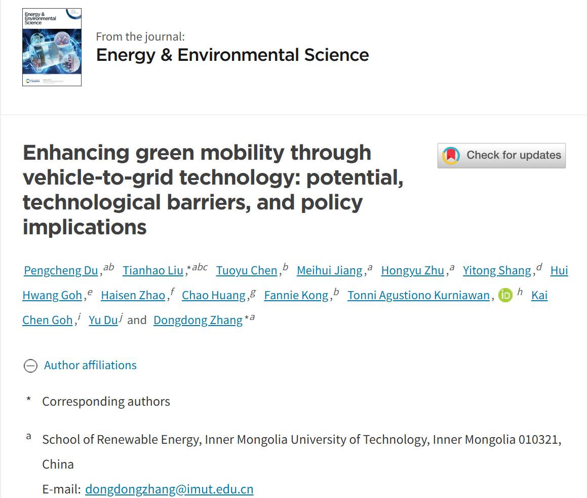 该研究成果受到国家自然科学基金(52107083、52307072、62372039));广西重大科技专项(AA22068071);“科创甬江2035”关键技术突破计划项目双碳科技专项(2024Z250))等项目支持。相关研究文章“Enhancing green mobility through vehicle-to-grid technology: potential, technological barriers, and policy implications”(DOI: https://doi.org/10.1039/D5EE00116A)在国际能源领域顶刊《Energy & Environmental Science》(中国科学院一区TOP,IF:32.4)发表,并入选期刊封面论文(入选率5%左右)。pg娱乐张冬冬教授为论文通讯作者,张冬冬教授所指导的博士生杜鹏程为第一作者,pg娱乐为论文第一单位和通讯单位。(文章链接https://pubs.rsc.org/en/Content/ArticleLanding/2025/EE/D5EE00116A)