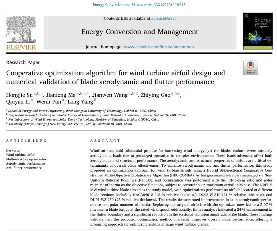 目前,该研究成果受到国家自然科学基金No.52366017、No.51966014;内蒙古科技计划项目No.2021GG0436;内蒙古自然科学基金项目No.2023MS05003;内蒙古高校“青年科技英才”项目No. NJYT23021;内蒙古自治区直属高校基本科研业务费项目No.JY20240059支持。相关研究文章“Cooperative optimization algorithm for wind turbine airfoil design and numerical validation of blade aerodynamic and flutter performance”(DOI: https://doi.org/10.1016/j.enconman.2025.119818)在国际期刊Energy Conversion and Management》(中国科学院一区TOP,IF:9.9)发表pg娱乐2021级博士研究生苏宏杰为第一作者,马剑龙教授为通讯作者,pg娱乐为论文第一单位和唯一通讯单位。