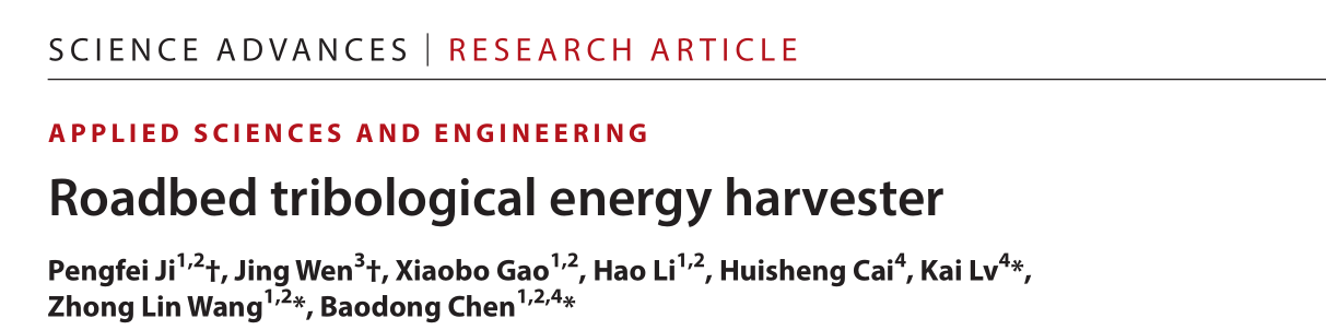 近日,pg娱乐材料科学与工程学院吕凯教授中国科学院北京纳米能源与系统研究所王中林院士、陈宝东研究员作为共同通讯作者在Science子刊《Science Advances》(中国科学院 JCR 一区TOP)上发表题为“Roadbed tribological energy harvester”的研究文章。