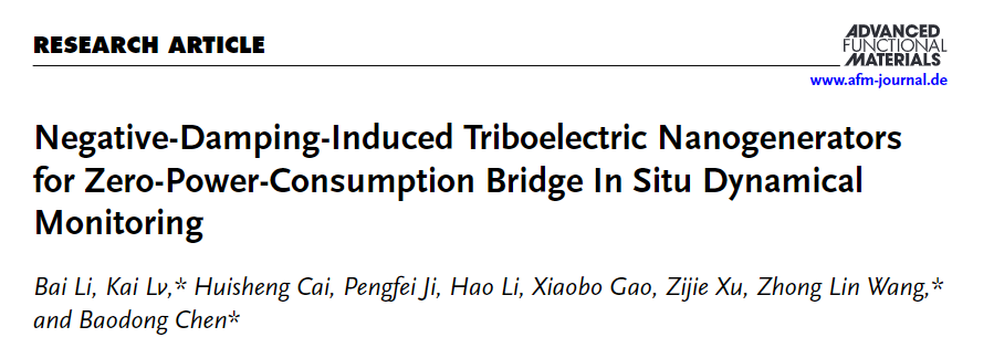 该研究成果受到国家重点研发计划项目2023YFB2604600和内蒙古自治区中央引导地方科技计划项目2023ZY0018资助。相关研究文章Negative-Damping-Induced Triboelectric Nanogenerators for Zero-Power-Consumption Bridge In Situ Dynamical Monitoring在国际期刊《Advanced Functional Materials》(中国科学院JCR一区,IF:19)发表吕凯教授与中国科学院北京纳米能源与系统研究所王中林院士、陈宝东研究员为共同通讯作者,pg娱乐2023级博士研究生为第一作者,pg娱乐为论文第一完成单位。