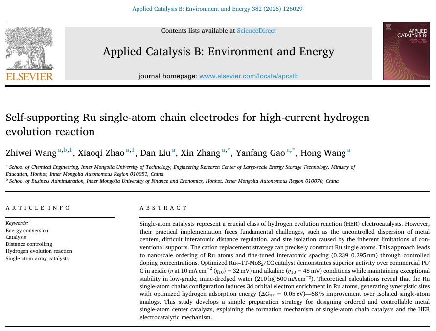近日,pg娱乐高艳芳教授、张欣副教授团队在国际知名期刊《Applied Catalysis B: Environment and Energy》(中国科学院一区TOP,IF:21.1)上发表了一篇题为“Self-supporting Ru Single-Atom Chain Electrodes for High-Current Hydrogen Evolution Reaction”(DOI: https://doi.org/10.1016/j.apcatb.2025.126029)的研究论文。高艳芳教授、张欣副教授为共同通讯作者,团队中的2020级博士研究生王志伟和2022级博士研究生赵晓琦为共同第一作者,pg娱乐为论文第一通讯单位。