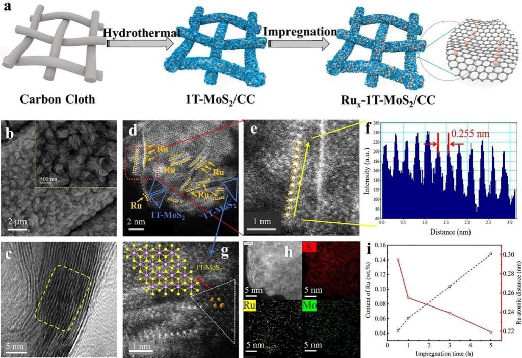 图1 Rux-1T-MoS2/CC单原子链催化剂的设计及微观形貌表征