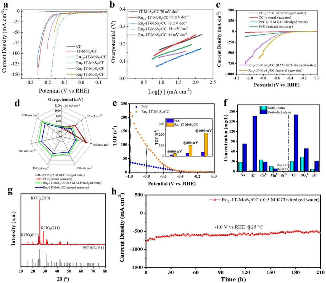 研究中,团队创新性提出“阳离子置换制备单原子链Ru1-1T-MoS₂/CC催化剂”的研究策略,并将其应用于电解水制氢研究,为该领域催化材料开发提供新路径。从性能表现来看,Ru1-1T-MoS2/CC催化剂优势突出:一方面Ru负载量超低,常规酸性条件下,10mA·cm-2电流密度对应的过电位仅为88mVvs.RHE;常规碱性条件下,该过电位进一步降至5mV,性能优于多数已报道的Ru-MoS₂催化剂。另一方面,在电解非常规低品位矿井疏干水时,其性能远超商业Pt/C催化剂,前者过电位为373mV,周转频率(TOF)达101.08H2·s-1,后者过电位为396mV,TOF 仅为24.33H2·s-1。本研究不仅构建了有序可控金属单原子中心催化剂的简易制备方案,更深入解析了单原子链催化剂的形成机理与HER电催化机理,为该领域技术创新与理论研究提供双重支撑。