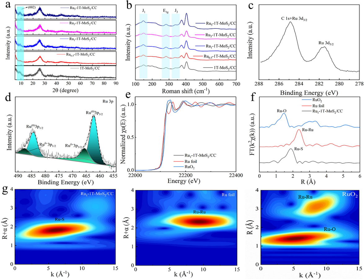 图2 Rux-1T-MoS2/CC单原子链催化剂的结构表征