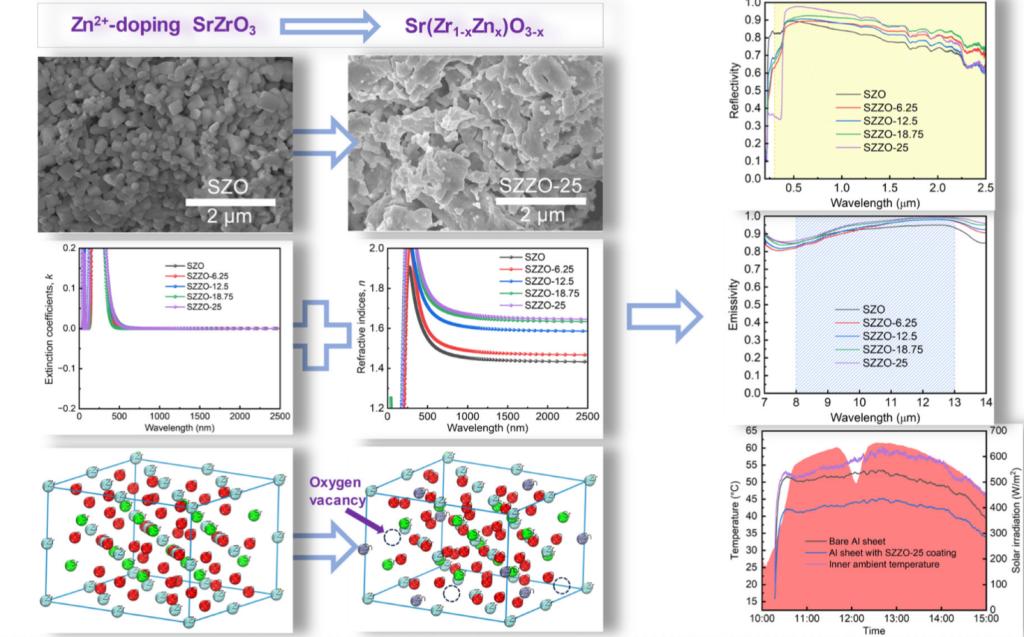 该研究结合实验与第一性原理计算,深入揭示了Zn掺杂对SrZrO₃光学性能的调控机制,为高性能无机辐射冷却材料的设计与开发提供了新思路。