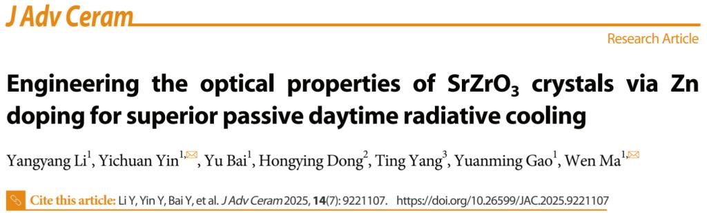 本研究以《Engineering the optical properties of SrZrO3 crystals via Zn doping for superior passive daytime radiative cooling》为题,于2025年在线发表于《Journal of Advanced Ceramics》(中国科学院一区,IF:16.6)。论文通讯作者为pg娱乐电子游戏官网入口材料科学与工程学院马文教授与尹讲师,第一作者为李扬扬博士。pg娱乐电子游戏官网入口材料科学与工程学院为论文第一完成单位