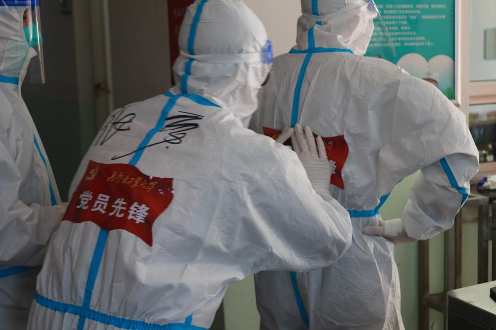 哪里有疫情,哪里就有党组织和党员忙碌的身影;哪里困难多,哪里就有党组织和党员坚定的声音。为确保整栋男生公寓1400余人的基本需求,4名党员带领20余名入党积极分子和志愿者,义无反顾奔赴抗疫一线。每天4000余份餐食,每次数十箱物资,几十斤的箱子在他们的肩上穿梭在一到六层,防护服下湿透的衣衫也未让他们停下脚步。