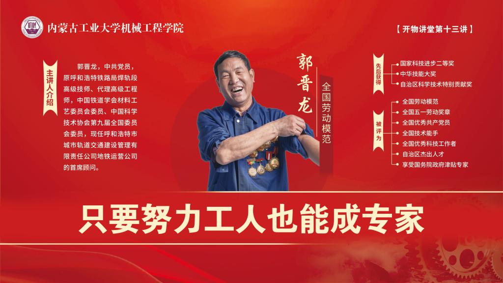 活动现场,全国劳动模范、全国五一劳动奖章、国务院特殊津贴、全国优秀科技工作者、自治区科学技术特别贡献奖获得者郭晋龙以“只要努力工人也能成专家”为题作专题讲座。郭晋龙结合个人 经历生动地讲述了自己扎根铁路焊轨事业,致力于技术研发创新,在枯燥的钢轨生产线上谱写卓绝人生的事迹他勉励学们怀揣梦想,不负韶华,树牢科技报国之志,掌握一技之长,做有理想、敢担当、能吃苦、肯奋斗的新时代好青年。