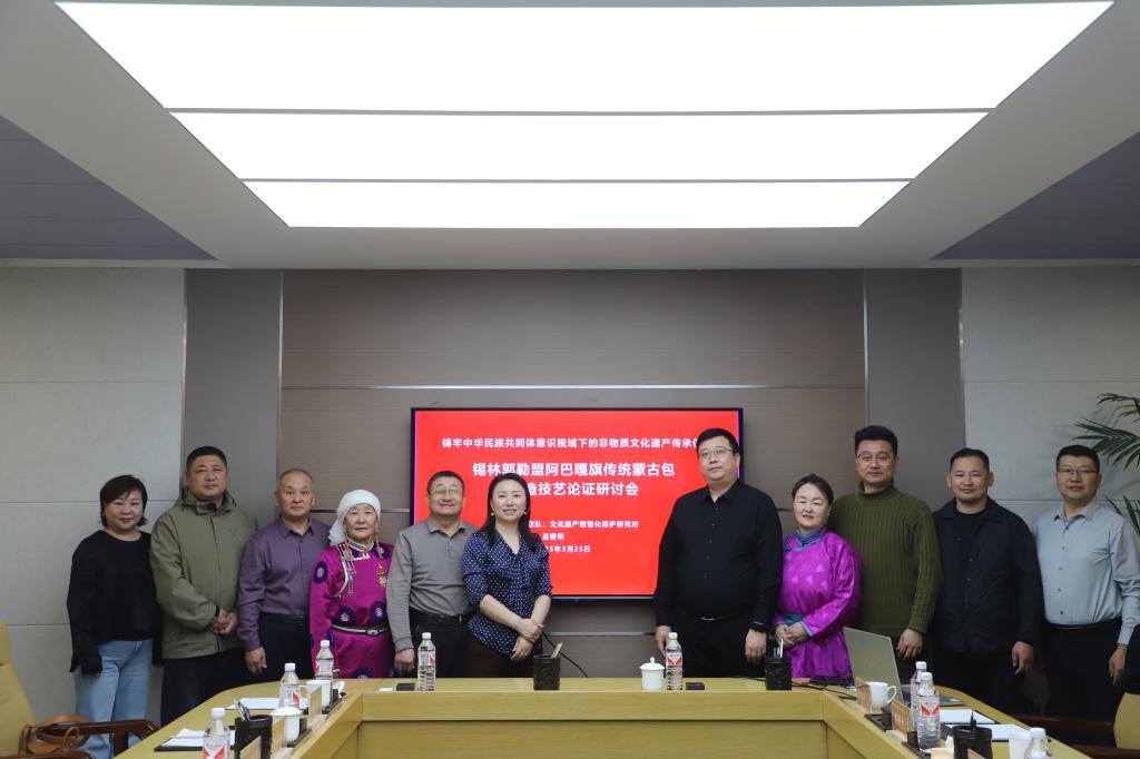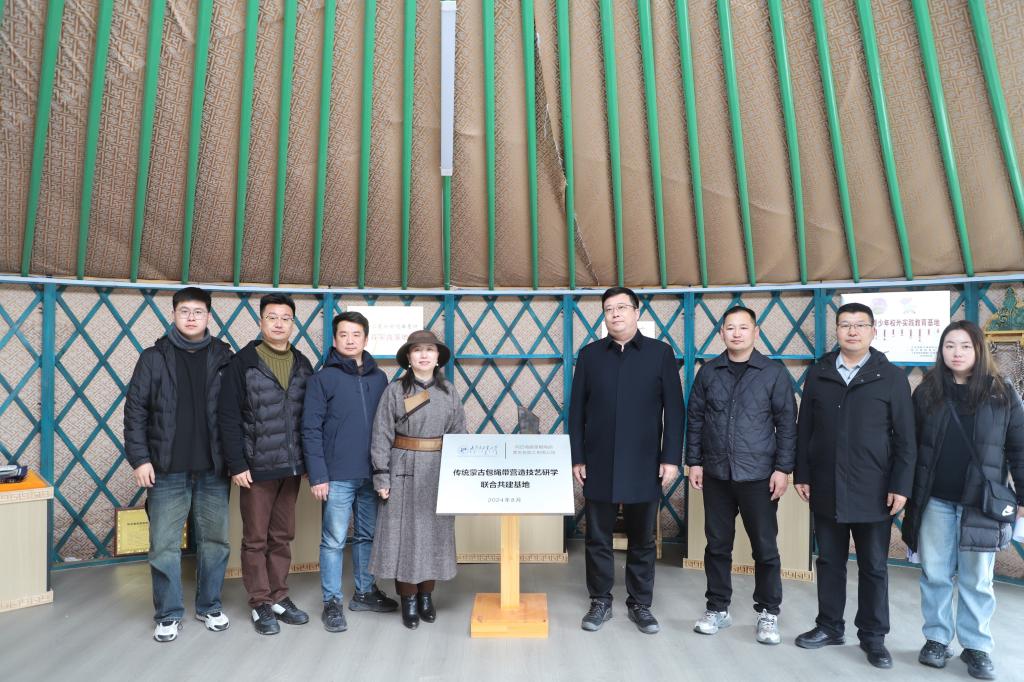 阿巴嘎旗非遗传承基地召开的“铸牢中华民族共同体意识、弘扬北疆文化——非物质文化遗产传承保护”论证研讨会上,pg娱乐建筑学院孟春荣教授围绕传统蒙古包制作技艺,从历史文化、工匠技艺、地方特色、传承困境及弘扬北疆文化方面进行研究论证及成果交流。会上,团队与蒙根陶丽蒙古包加工有限公司共同成立的传统蒙古包绳带营造技艺研学联合共建基地正式揭牌。
