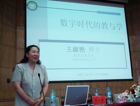 王淑艳教授作了题为《现代教育技术在英语教学中的应用》的报告。她从六个方面具体生动地讲述了数字时代英语教与学的趋势,表明了当前我们的教育观念与方法、教学内容与形式急需改变的迫切要求。