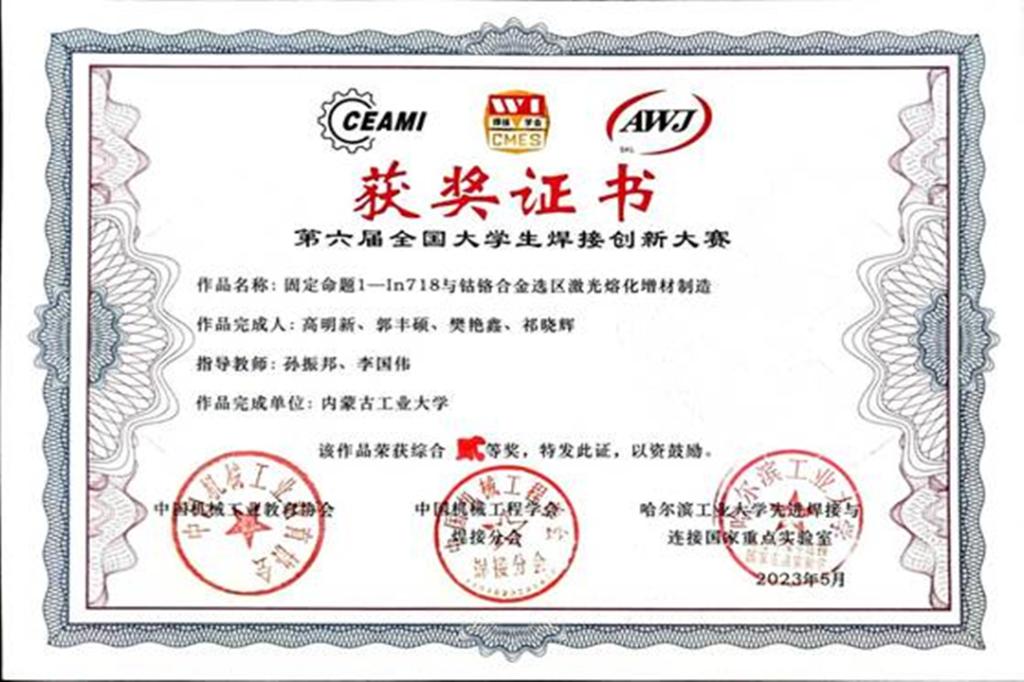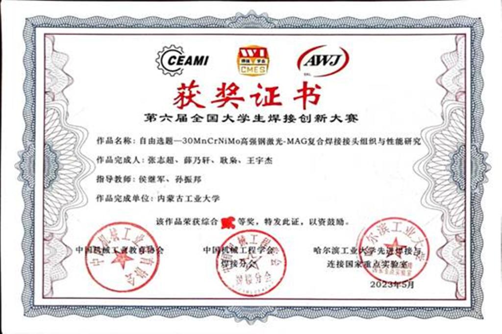 校材料科学与工程学院材料成型及控制工程(焊接方向)高明新、郭丰硕、樊艳鑫、祁晓辉同学In718与钴铬合金选区激光熔化增材制造》张志超、薛乃轩、耿枭、王宇杰同学的《30MnCrNiMo高强钢激光-MAG复合焊接接头组织与性能研究》二等奖。本次赛事由清华大学、哈尔滨工业大学、天津大学等57所高校173支队伍, 450余名师生参赛。