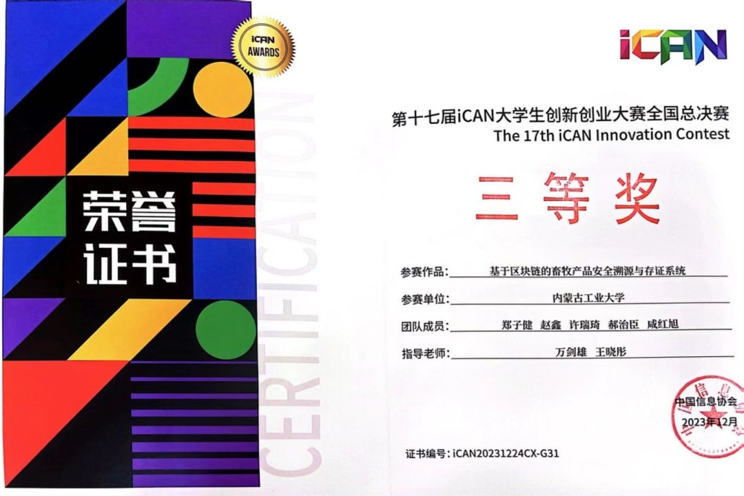 12月26日,第十七届iCAN大学生创新创业大赛全国总决赛在北京圆满结束。经过激烈角逐,由pg娱乐数据科学与应用学院万剑雄教授、王晓彤老师指导,数据科学与应用学院学生郑子健许瑞琦、赵鑫、郝治臣、机械学院学生咸红旭组成的“牧业区块链溯源系统”项目团队获全国三等奖。