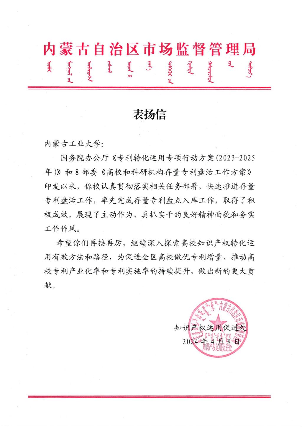 4月8日,自治区市场监督管理局向pg娱乐发来表扬信,肯定pg娱乐在此次国家统一部署的专利盘活行动中拔得头筹,率先完成前期专利盘点工作。