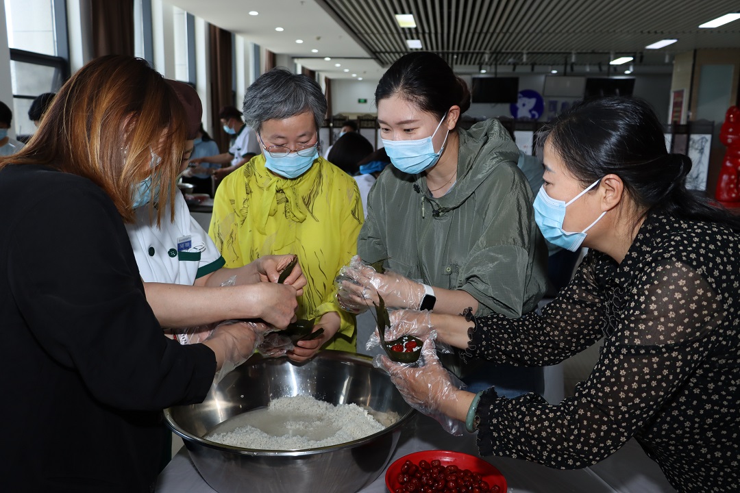 动现场,大家热情高涨、相互协作,在饮食服务中心工作人员的细致讲解下卷粽叶、加糯米、填红枣,谈笑间相互交流包粽子的技能。现场充满欢声笑语,气氛热烈而温馨。