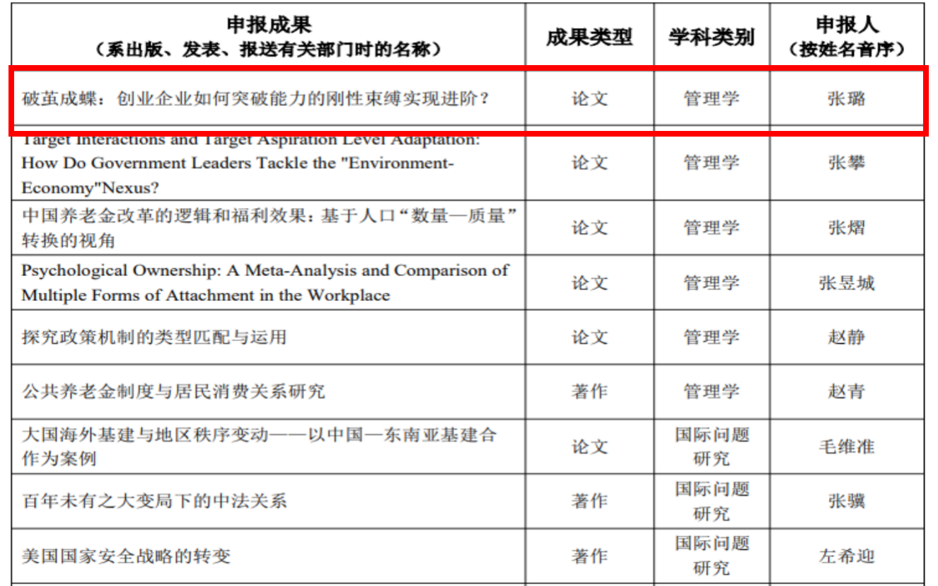 近日,教育部公布了第九届高等学校科学研究优秀成果奖(人文社会科学)评奖结果,pg娱乐经济管理学院二级教授、国家高层次人才特殊支持计划青年拔尖人才张璐为第一作者的论文《破茧成蝶:创业企业如何突破能力的刚性束缚实现进阶》荣获青年成果奖。
