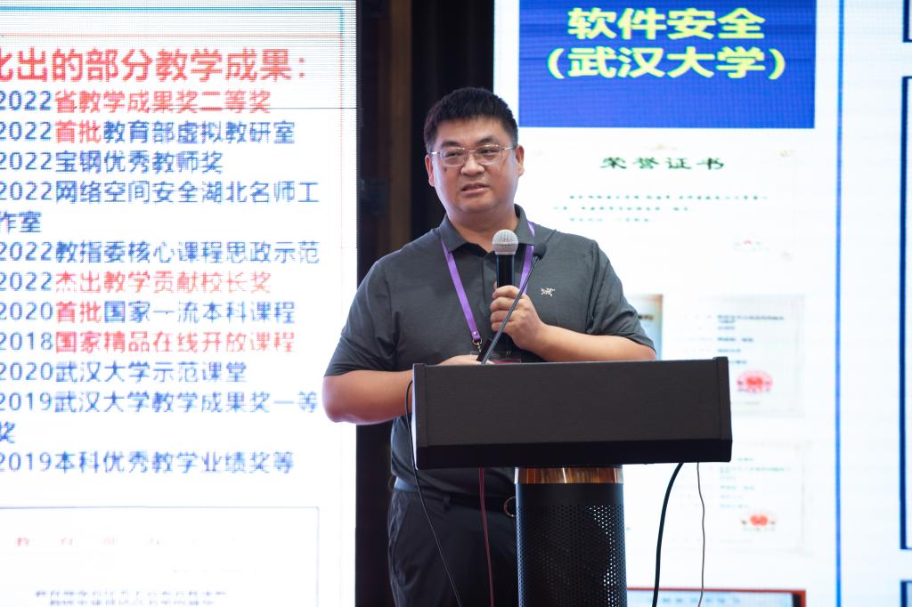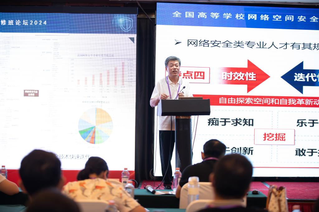 开幕式上,数据科学与应用学院(网络空间安全学院)院长王钢介绍学校产教融合特色化网络安全人才培养工作封化民教授题为“抓好课程建设,促进教师能力提升”主题报告。研修班举办期间,北京航空航天大学刘建伟教授、陕西师范大学杨波教授、武汉大学彭国军教授深入讲解“网络空间安全导论”“网络安全”“现代密码学”和“软件安全”等课程的教学内容、教学设计和方法、课程规划、教材和教学资源建设等内容,并对标《教育部关于国家级一流本科课程建设的实施意见》中对“国家级一流本科课程”的要求和建设经验深入交流,指导与会教师系统掌握网络空间安全核心课程的实施方法。