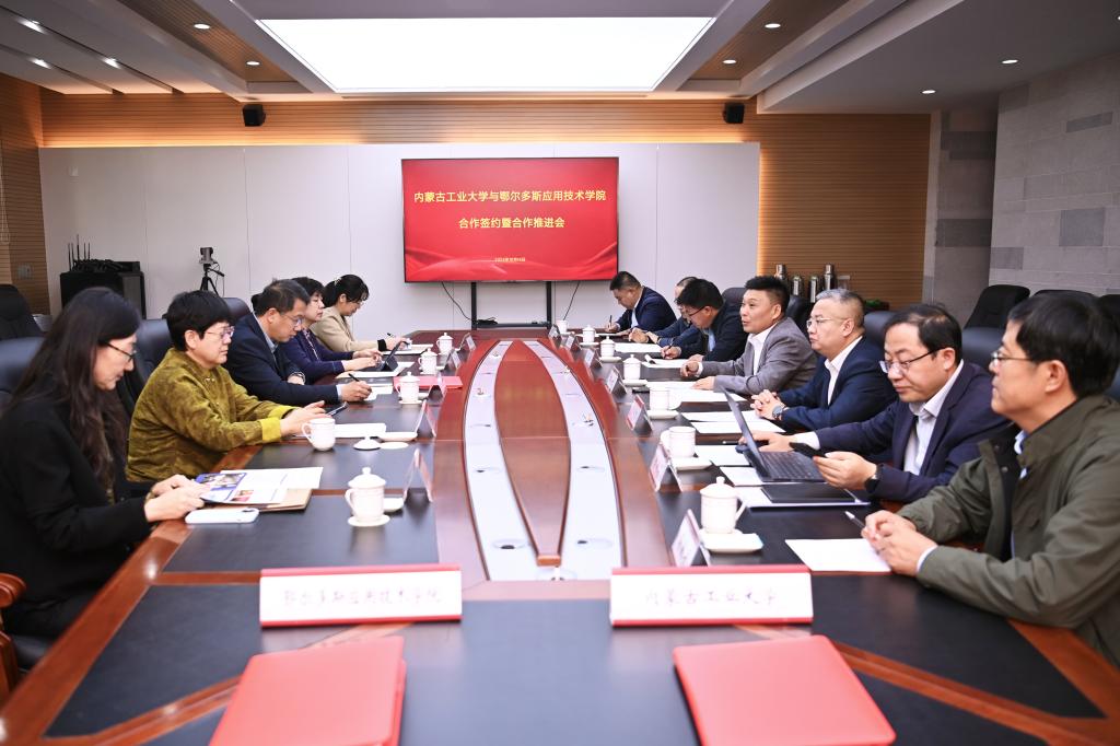 宝音介绍学校聚焦服务习近平总书记交给内蒙古的“五大任务”和全方位建设模范自治区两件大事在科学研究、学科建设、人才引育等方面取得的最新成果。他指出,工业大学与鄂尔多斯应用技术学院合作基础良好,在学科发展等多方面契合度高,希望两校进一步拓展合作空间,提升合作能级,携手助力内蒙古高等教育高质量发展。