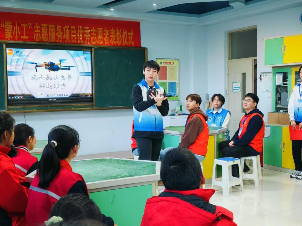 活动期间,志愿者们结合专业知识向小朋友们详细介绍了无人机的种类、用途、工作原理及发展历程等知识,并进行无人机飞行演示。小朋友们在志愿者的耐心指导下,体验无人机飞行操作,零距离感受科技的魅力。活动最后宣读2024年“蒙小工”志愿服务项目优秀志愿者名单,并为优秀志愿者颁发荣誉证书。