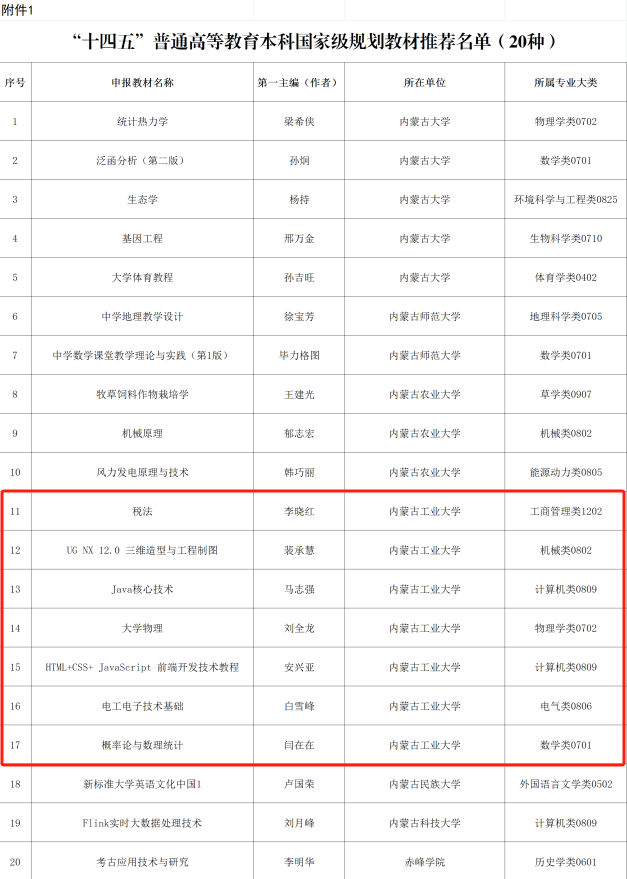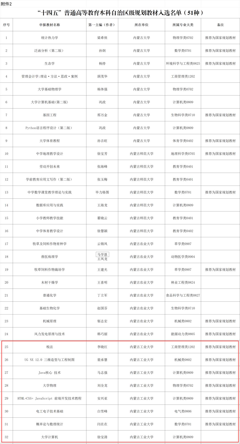 近日,内蒙古自治区教育厅发布《内蒙古自治区教育厅关于“十四五”普通高等教育本科规划教材自治区级入选名单和国家级推荐名单的公示》,认定51种教材为“十四五”普通高等教育本科自治区级规划教材,其中20种教材推荐国家级规划教材pg娱乐申报的8种教材全部成功入选“十四五”普通高等教育本科自治区级规划教材其中7种教材入选国家级推荐名单获批和推荐数量实现新突破。