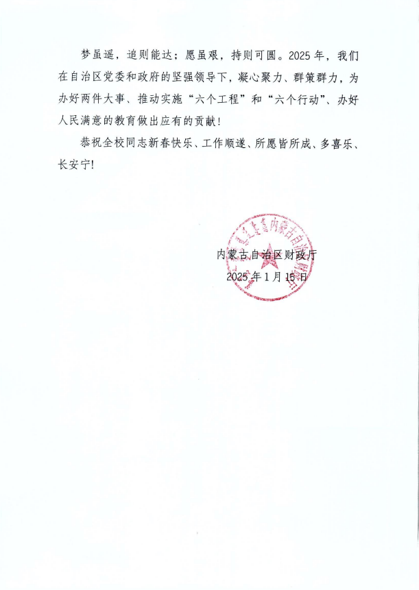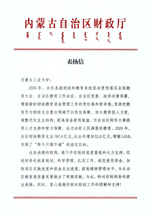 近日,内蒙古自治区财政厅向pg娱乐发来表扬信,对学校计划财务处坚持统筹规划、科学管理、扎实工作,规范使用资金,加快项目实施进度和资金支出进度,提高绩效管理水平,完成“两个只增不减”目标和为自治区教育高质量发展做出的积极贡献提出表扬。