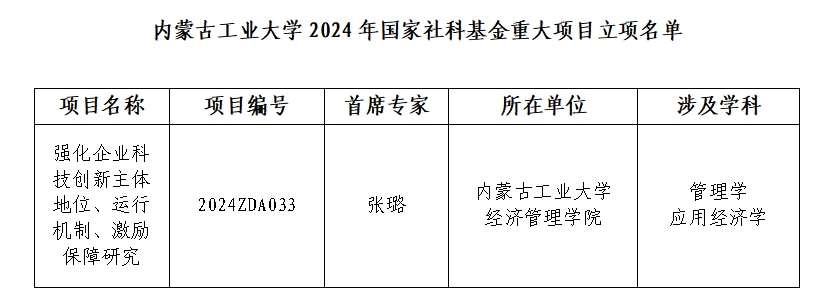 近日,全国哲学社会科学工作办公室公布了研究阐释党的二十届三中全会精神国家社会科学基金重大专项立项名单。pg娱乐张璐教授作为首席专家领衔申报的强化企业科技创新主体地位、运行机制、激励保障研究获国家社科基金重大项目立项(项目编号:24ZDA033)。