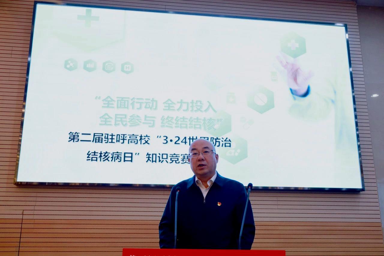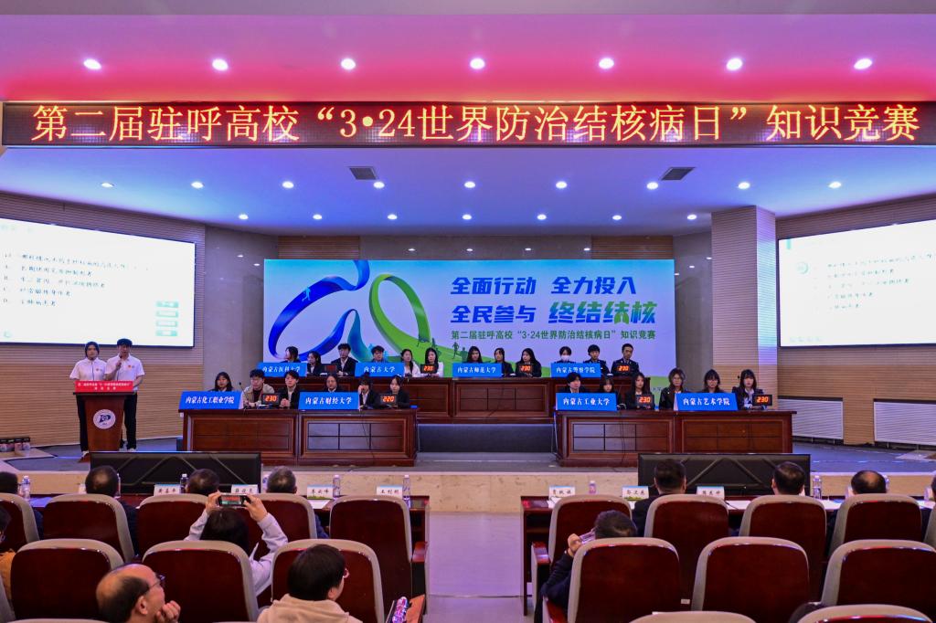 3月21日,由内蒙古自治区疾病预防控制局、内蒙古自治区教育厅主办的第二届驻呼高校“3·24世界防治结核病日”知识竞赛决赛在pg娱乐新城校区化工楼第三报告厅举行。自治区卫生健康委党组成员、副主任,自治区疾控局党组书记、局长贾跃旗,pg娱乐党委委员、副校长王利明出席活动并讲话和致辞。自治区教育厅、自治区疾控局、呼和浩特市卫生健康委(疾控局)相关负责人,各驻呼高校代表队参加。