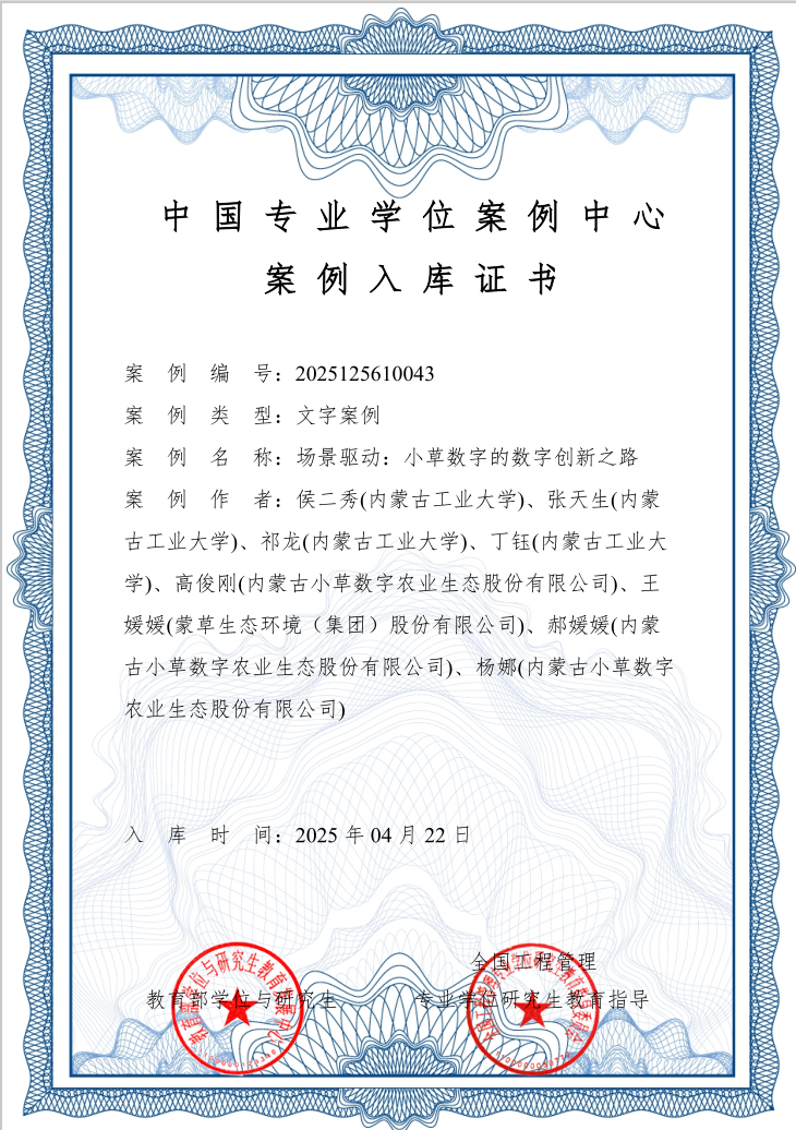 4月22日pg娱乐经济管理学院侯二秀教授研究团队、蒙草生态环境(集团)股份有限公司和内蒙古小草数字农业生态股份有限公司管理团队联合开发的案例场景驱动:小草数字的数字创新之路教育部学位与研究教育发展中心中国专业学位案例中心收录入库。这是pg娱乐首篇成功入库教育部中国专业学位案例中心的工程管理专业教学案例。