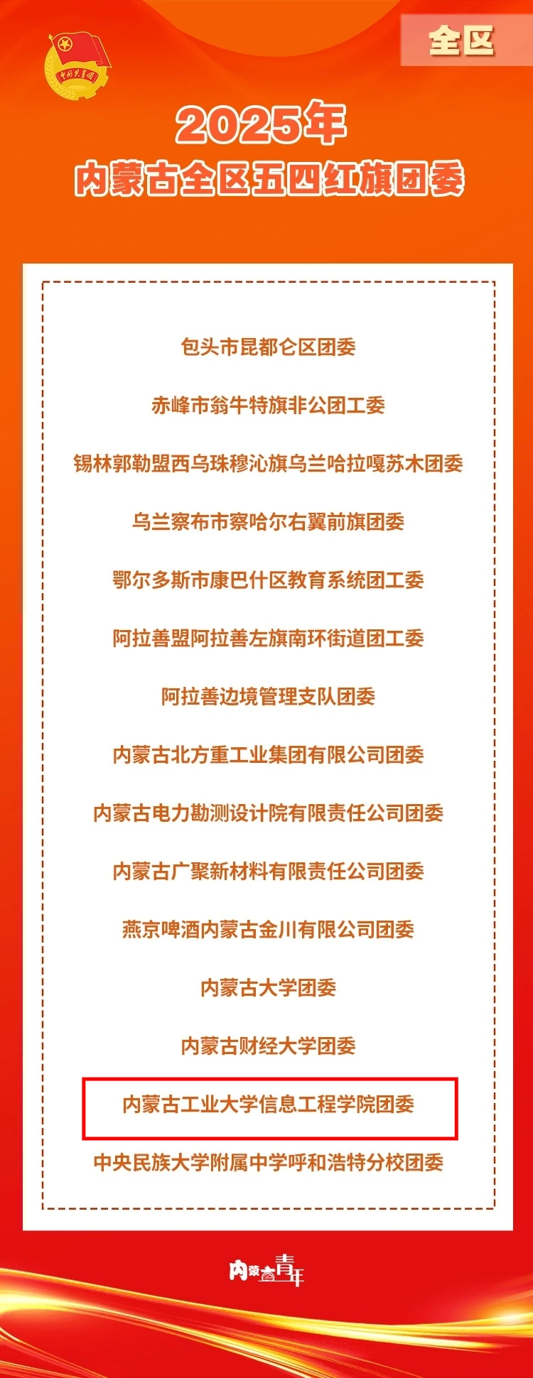 近日,内蒙古自治区团委发布2025年度全区“两红两优”名单,决定授予44名同志“全区优秀共青团员”荣誉称号,授予36名同志“全区优秀共青团干部”荣誉称号,授予 15个团委“全区五四红旗团委”荣誉称号,授予25个团支部“全区五四红旗团支部”荣誉称号,pg娱乐信息工程学院团委光荣上榜