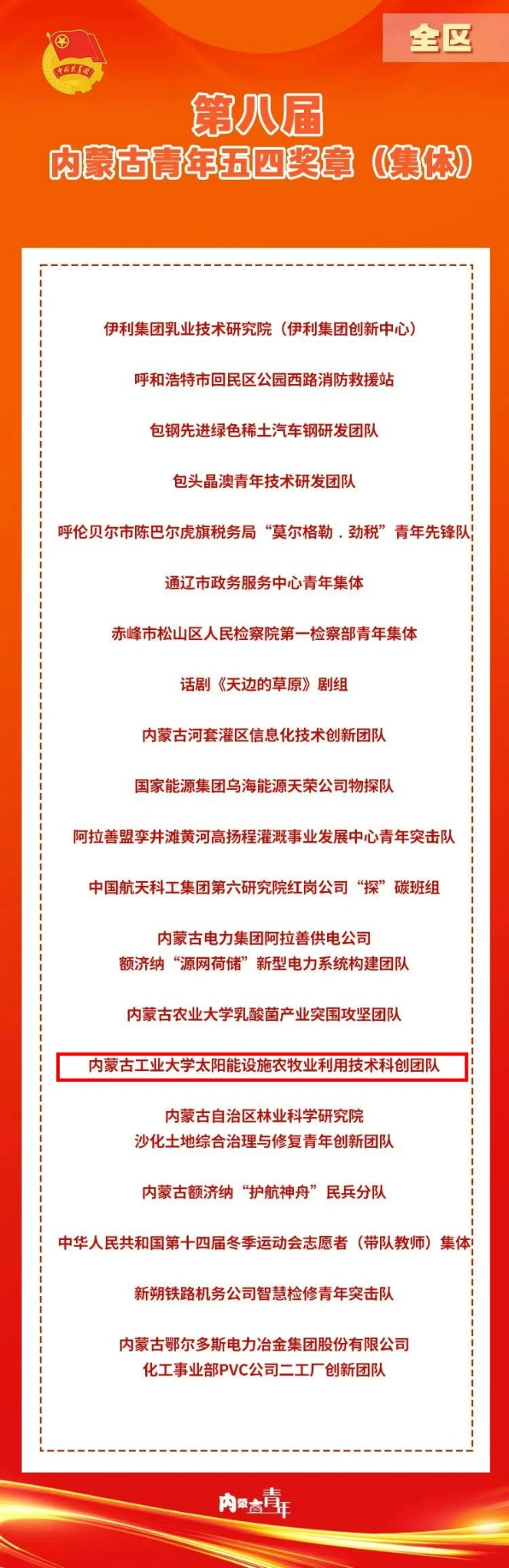 近日,内蒙古自治区团委于公布授予全区20个单位2025年“内蒙古青年五四奖章集体”荣誉称号,pg娱乐太阳能设施农牧业利用技术科创团队榜上有名