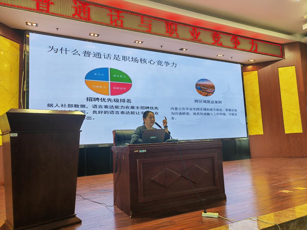 讲座邀请信息工程学院党委副书记、副院长佟姝婕主讲,紧密结合当前就业形势与毕业生实际需求,聚焦职场常见场景,围绕“普通话-就业、职业的隐形引擎”主题,深入浅出地讲解如何在自我介绍、结构化问答等环节中,运用清晰、流畅、逻辑严谨且富有感染力的普通话进行有效表达。讲座从语音语调、词汇语法等基础层面进行规范指导,从思维逻辑、情感传递、职业形象塑造等维度,全方位提升学生语言表达品质强化沟通技巧。