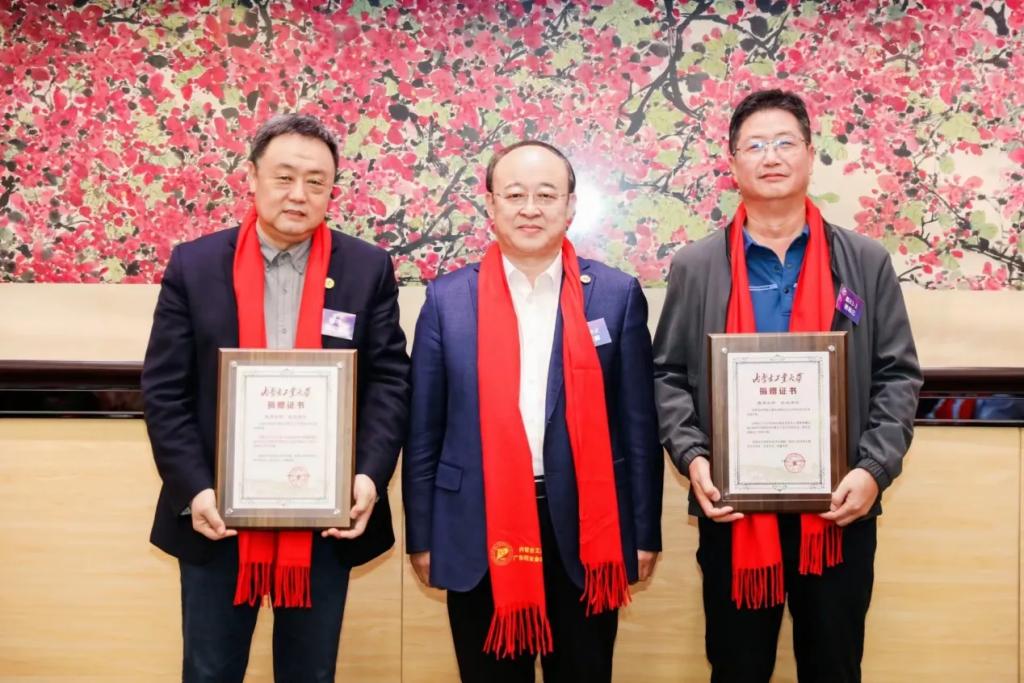 李占峰向贺有云(右一)、张忠义(左一)校友颁发捐赠证书
