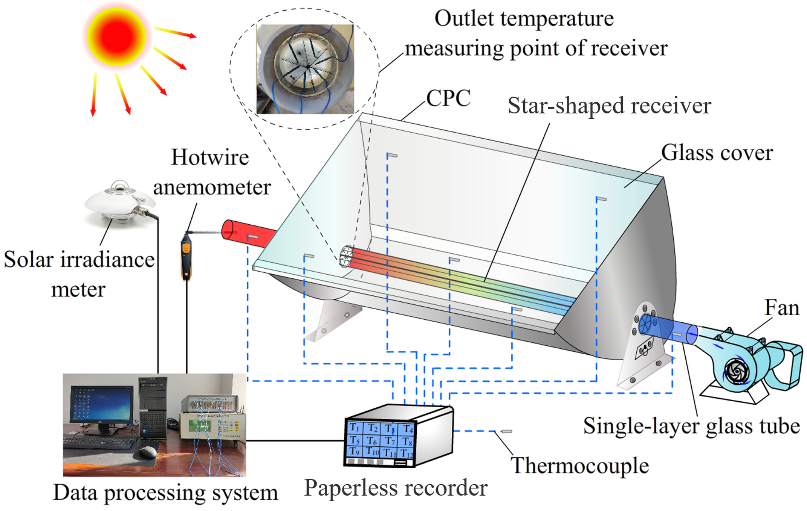 此外,针对传统太阳能聚光装置对日跟踪精度要求高、投资成本大的问题,团队博士研究生刘雪东对系统中槽式复合抛物面聚光集热装置进行研究,并在国际权威期刊《Solar Energy》发表题为"Design and experimental analysis of air heating performance of a star-shaped receiver in a non-tracking compound parabolic concentrator"的研究论文DOI:10.1016/j.solener.2023.02.054)。