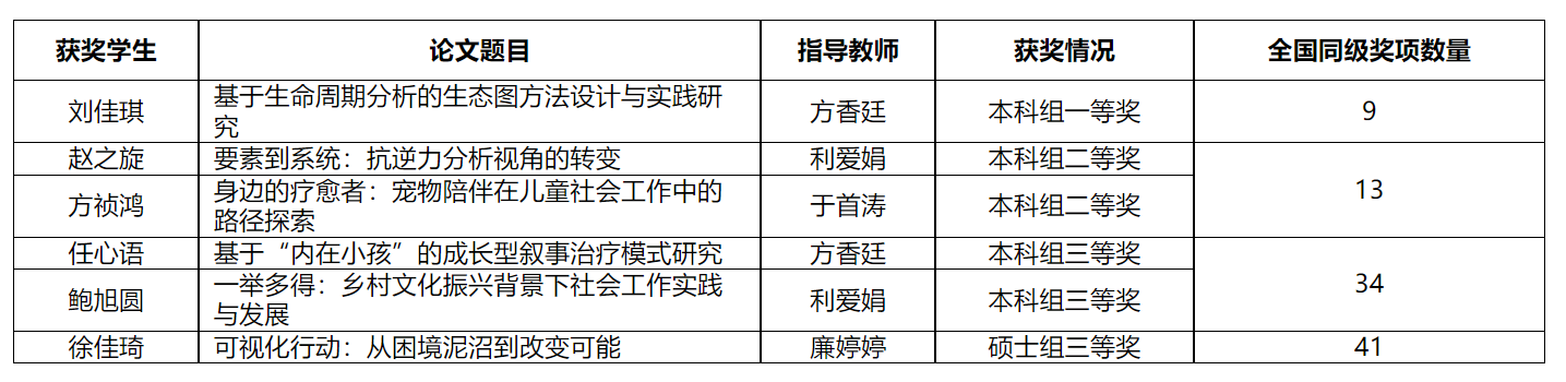 1月11日至12日,由中国社会工作教育协会主办、重庆工商大学承办的第十四届中国社会工作大学生论坛暨第七届研究生论坛在线举行。来自全国90余所高校的300余名社会工作专业本专科生、研究生参加论坛。pg娱乐学生的12篇学术论文入选,共获得一等奖1项、二等奖2项、三等奖3项本次获奖是社会工作专业“见微书院”团队育人的实践成果,将有力推动社会工作国家级一流本科专业建设。